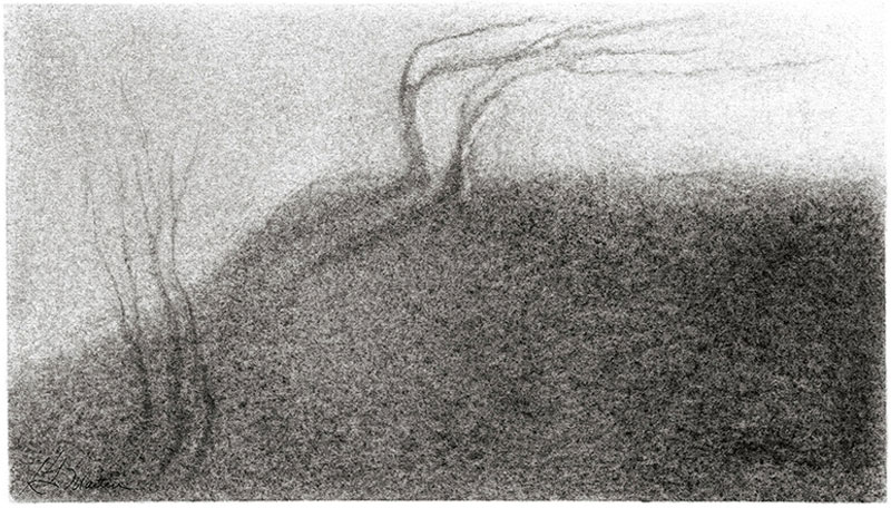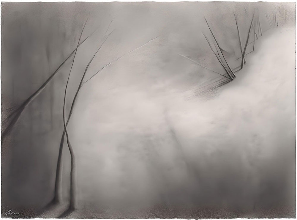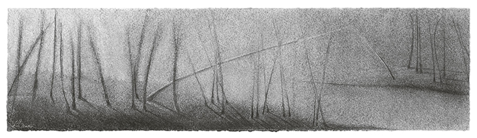 I see a quiet humanity in the forms of trees. In winter, their elegant network - 'their bones', are fully revealed and have inspired my drawings over time. They are delicate and quite strong, with a diversity of space between their trunks and branches. I draw them without leaves to evoke a greater connection with the human form in a very abstract way. The landscapes are spare, with only the essentials to tell a story. I begin with a felt sense of emotion to convey and deep space to enter.